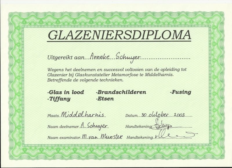 Hierna volgde ik een omscholingscursus tot Glazenier bij een Glaskunst Atelier in Middelharnis waar diverse soorten van glasbewerken aan bod kwamen zoals;